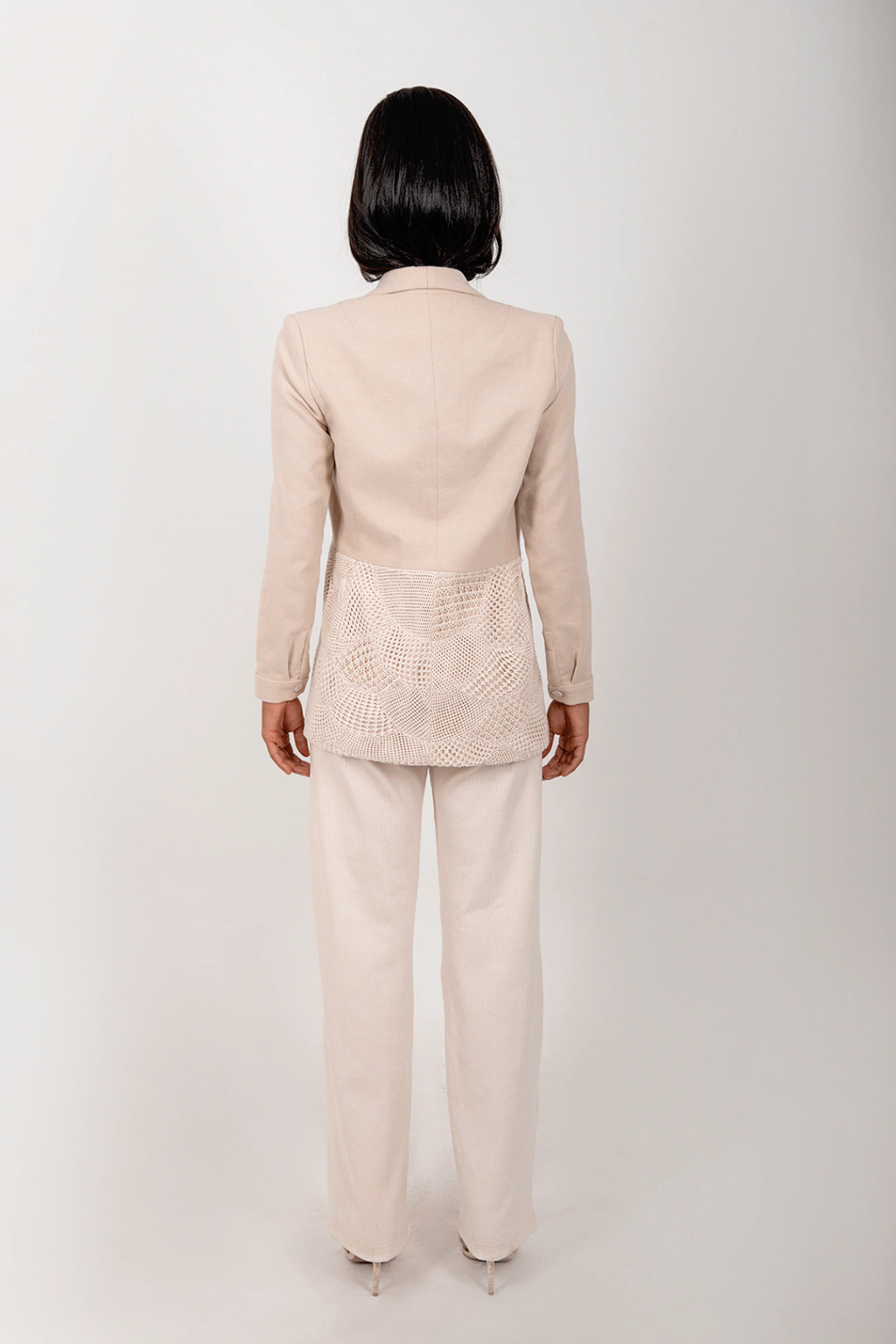 O destaque fica por conta do toque artesanal e a base de renda renascença. O trabalho desenvolvido pela Natural Cotton Color é a renda renascença incrustada, ou seja, os pontos da renda são elaborados diretamente sobre o tecido. As mangas tem punhos e botões como uma camisa, adicionando um charme único ao blazer.