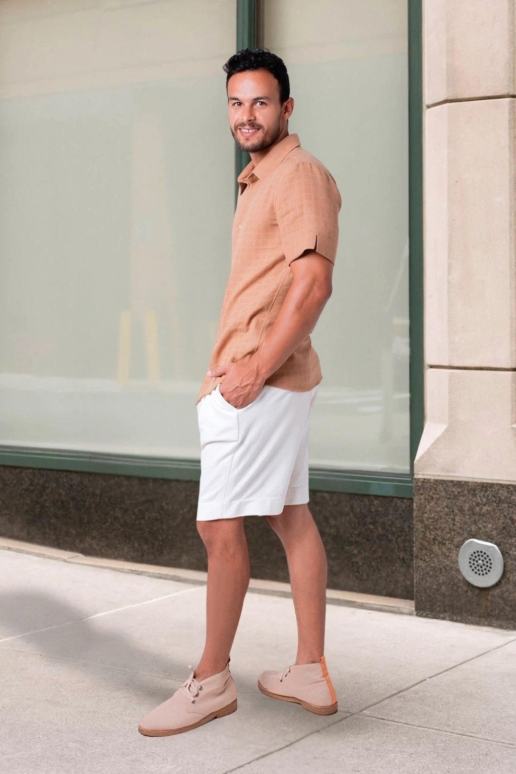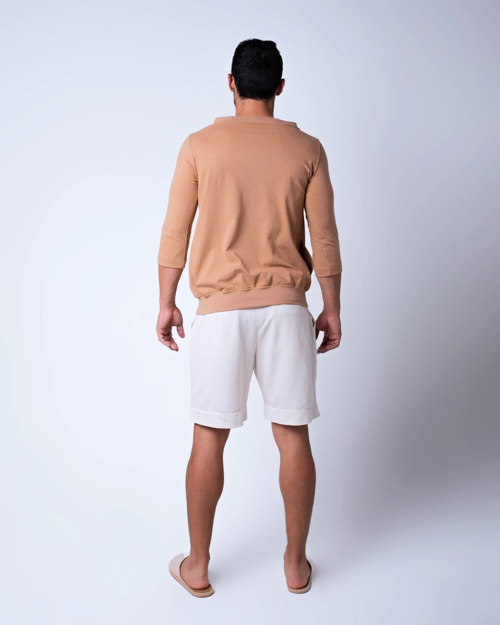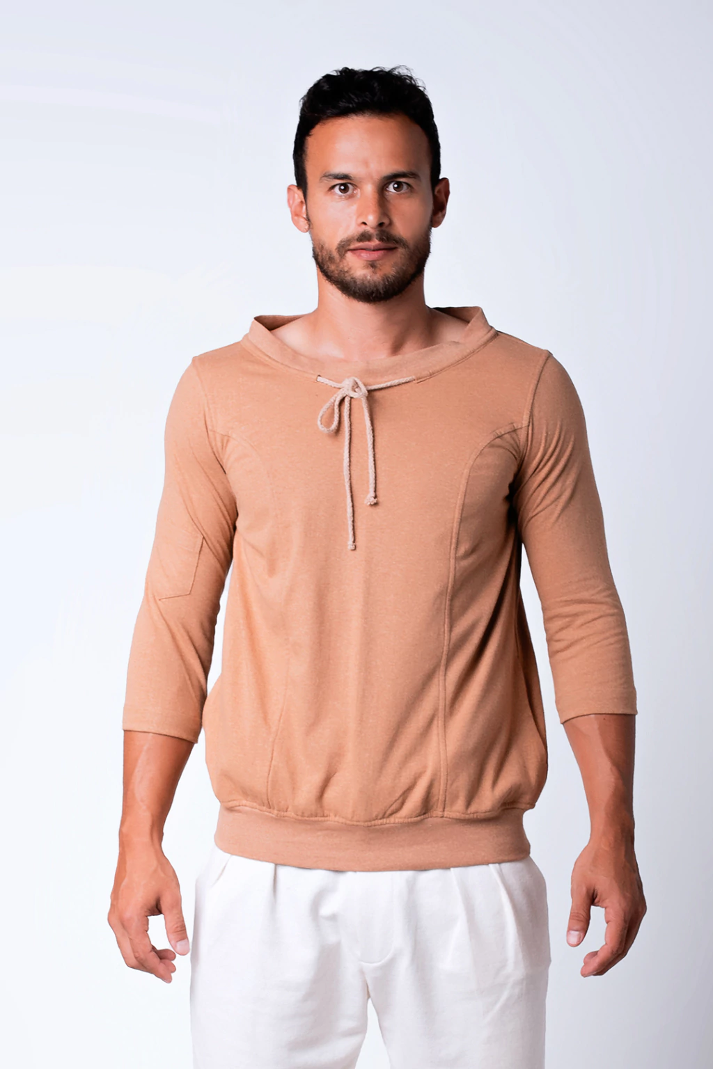 Com gola estilo canoa com cordão, a blusa agênero tem mangas 3/4 para ser usada no dia a dia. O diferencial é a costura dupla na parte frontal, além do tecido exclusivo com uma mistura de algodão orgânico com seda.