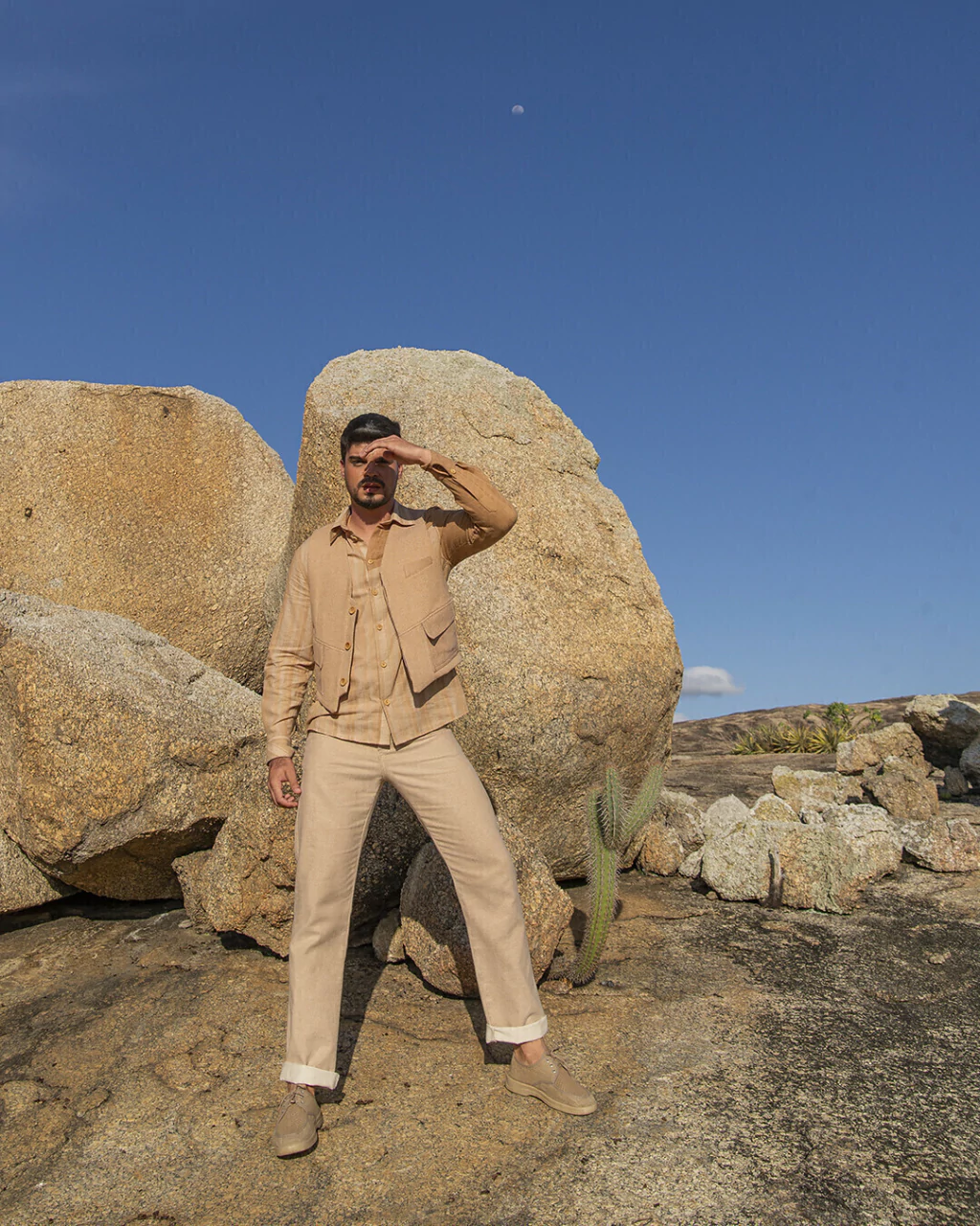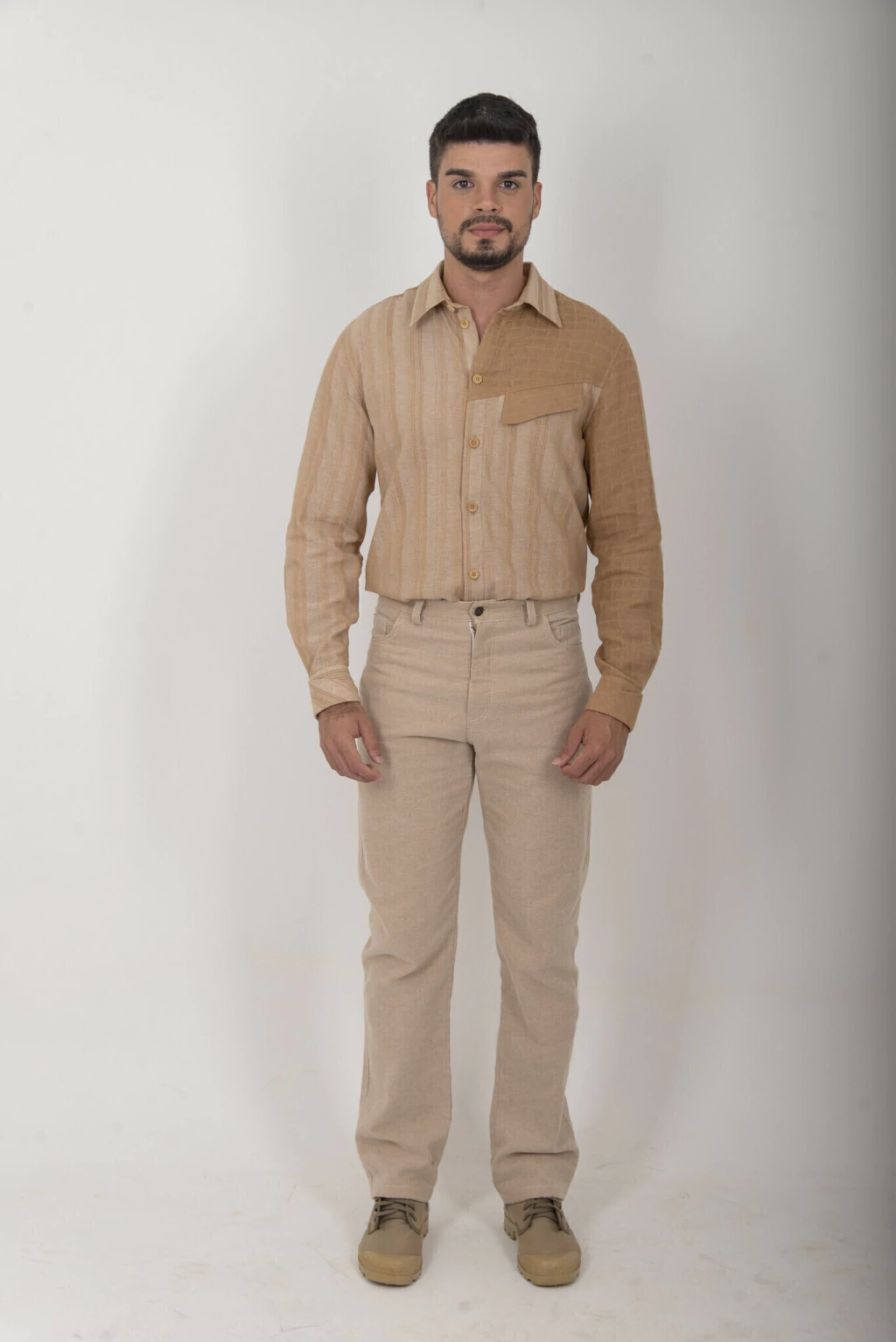 Uma camisa que eleva a outro nível seu estilo diário, com elegância e criatividade para espaços de trabalho ou de lazer. A peça de alfaiataria foi criada a partir de um mix de padrões de tecido em algodão orgânico possui botões de madeira.