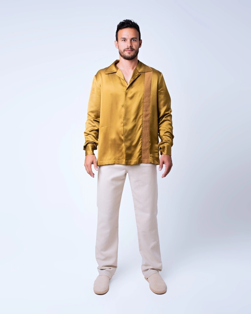 Eleve o seu estilo com camisa produzida em seda brasileira tingida com erva mate com botões de madrepérola. A faixa frontal vertical em outro tom deixa a peça mais arrojada.