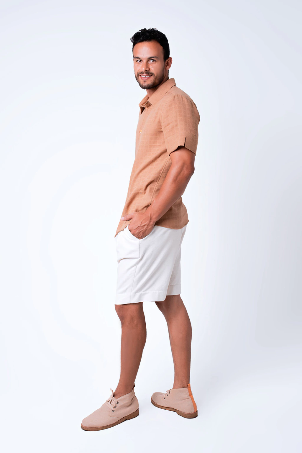 Camisa masculina em tecido plano de algodão orgânico. O tecido artesanal é do tipo gaze, mais leve e poroso (reticulado) que garante o aspecto natural do algodão e uma certa transparência.