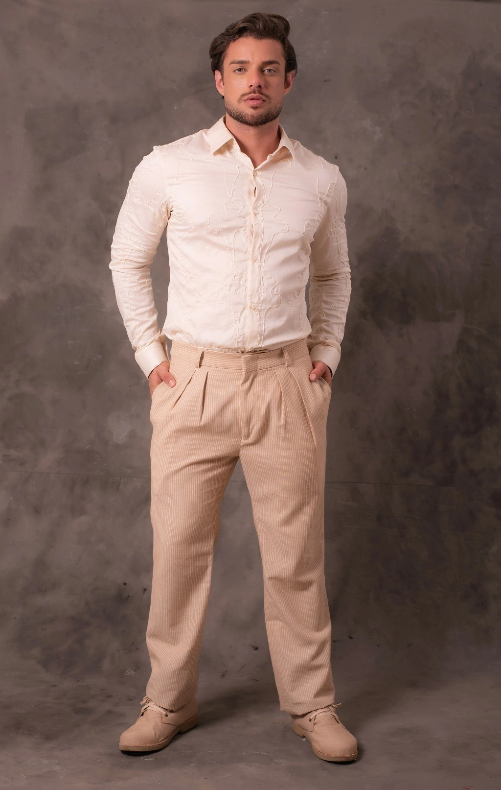 Camisa masculina em tricoline de algodão orgânico com bordado manual e tingimento de beterraba. Botões de madrepérola.