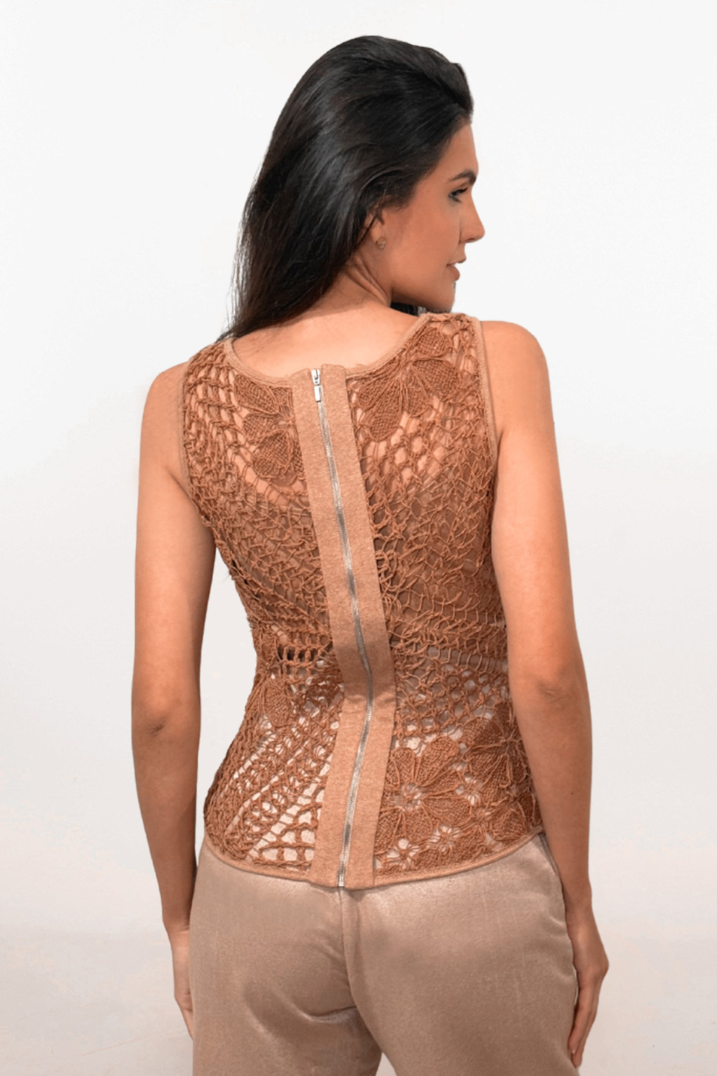 Uma peça versátil e sofisticada, que pode ser usada de duas formas: como uma elegante blusa tipo regata com zíper nas costas ou como um colete delicado, aberto na frente. A renda filé, trabalhada artesanalmente pelas talentosas artesãs de Orós, no Ceará, confere um toque exclusivo à peça. Para um acabamento ainda mais especial, a blusa é tingida com corantes naturais à base de casca de caju, ressaltando a beleza da tradição têxtil brasileira.