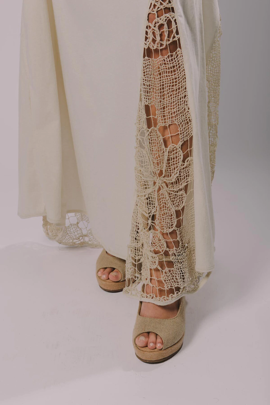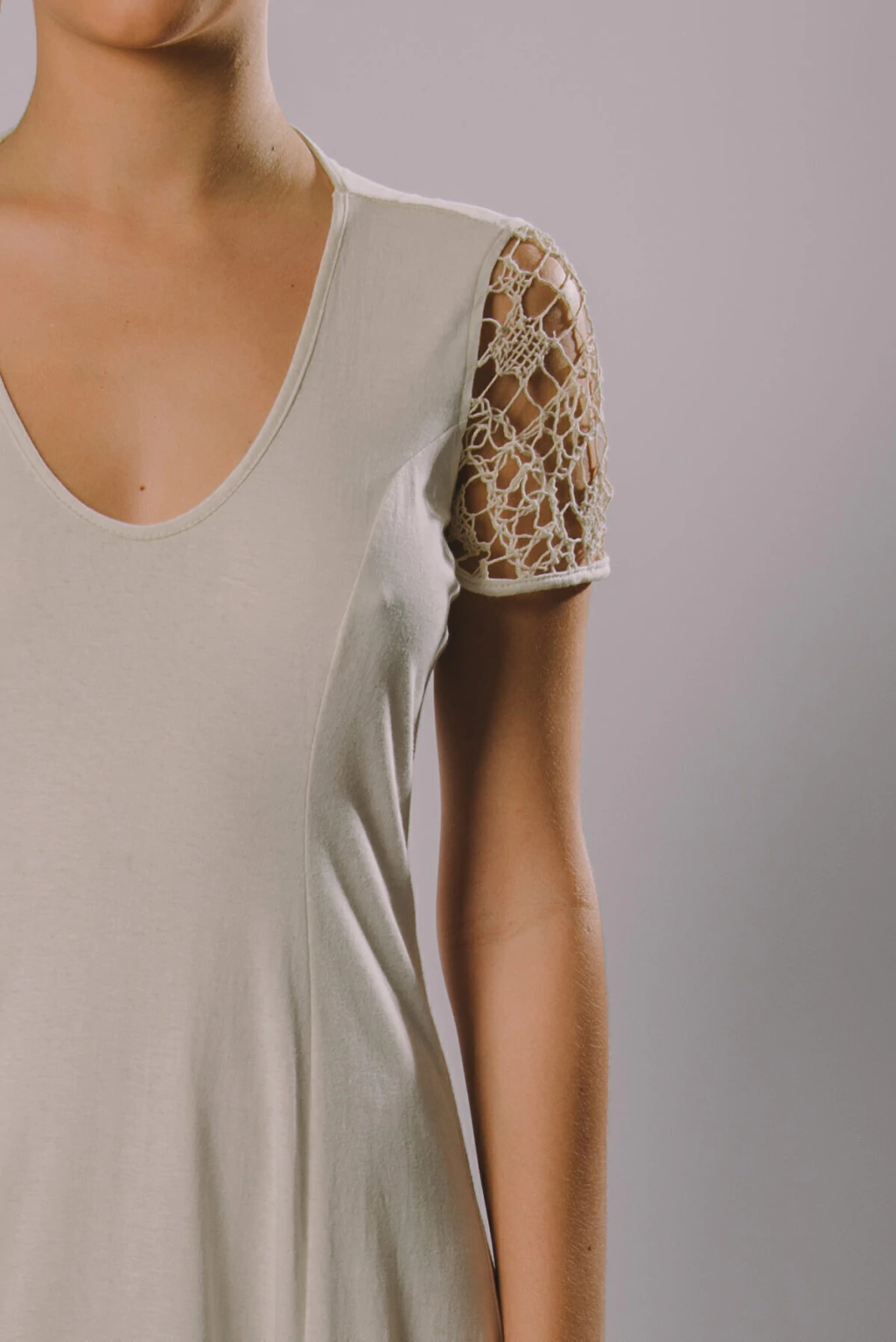 Vestido em malha de algodão orgânico com mangas e nesgas nas laterais feitas na técnica artesanal renda filé. A nesga (pedaço triangular) aumenta a largura do vestido dando fluidez e ainda mais charme ao seu movimento. Opção marrom e bege.