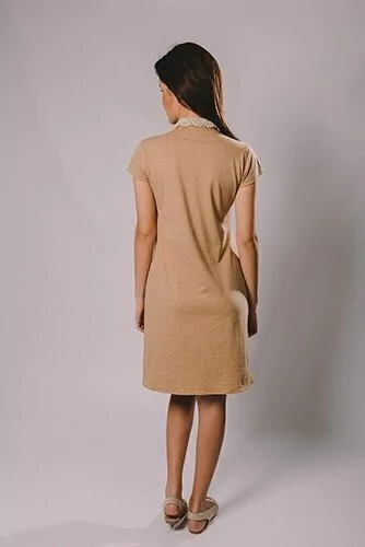 O vestido pólo é feito em malha de algodão orgânico que já nasce colorido. O desenho clássico e atemporal do modelo polo traz elegância com praticidade para qualquer mulher ativa. A gola é feita à mão em renda renascença, uma técnica artesanal feita com agulha, linha e lacê de algodão. A renda renascença é patrimônio cultural imaterial da Paraíba.